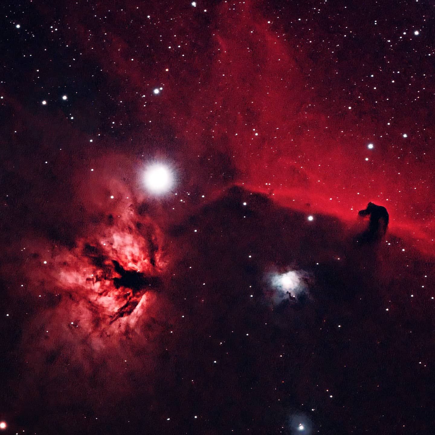 Flame Nebula (NGC 2024) and Horsehead Nebula in the constellation Orion. This is an integration of 35x180s exposures at ISO 800 with a Nikon Z7ii and a Skywatcher Esprit 100 on a HEQ5 mount. Stacked in AstroPixelProcessor.