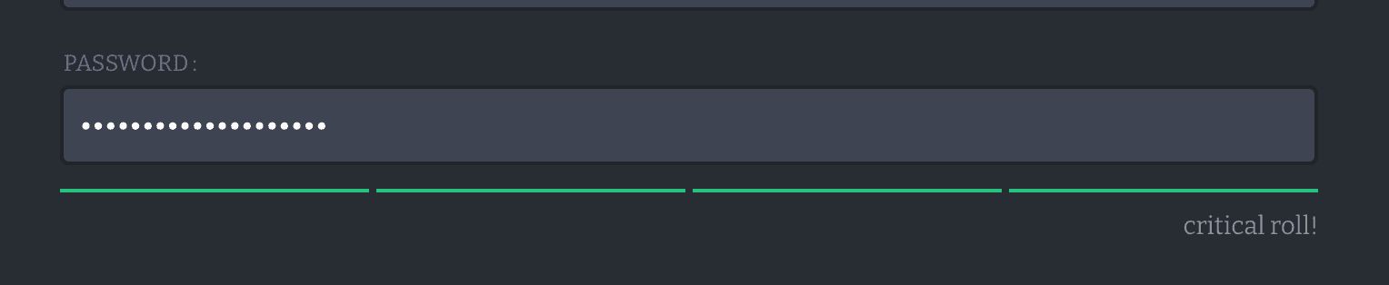 Our password field could be improved by giving some indication of password strength. For this I chose to use the React Password Strength Bar package. You can customise the scoreWords and shortScoreWord however you please to reflect password strength. For fun, I’m using a D&D theme 🙂